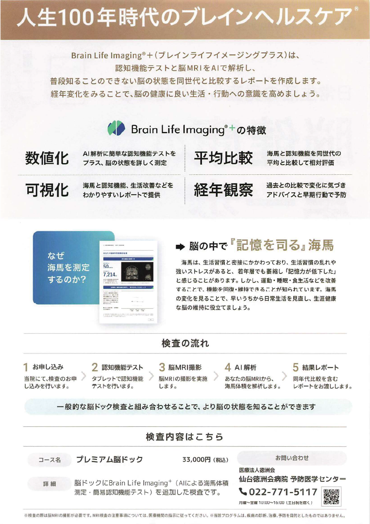 プレミアム脳ドックのご案内 2025/11/21 プレミアム脳ドックのご案内 価格:33,000円(税込) 申込方法:窓口または仙台徳洲会病院 予防医学センターまでお電話ください。 TEL:022-771-5117