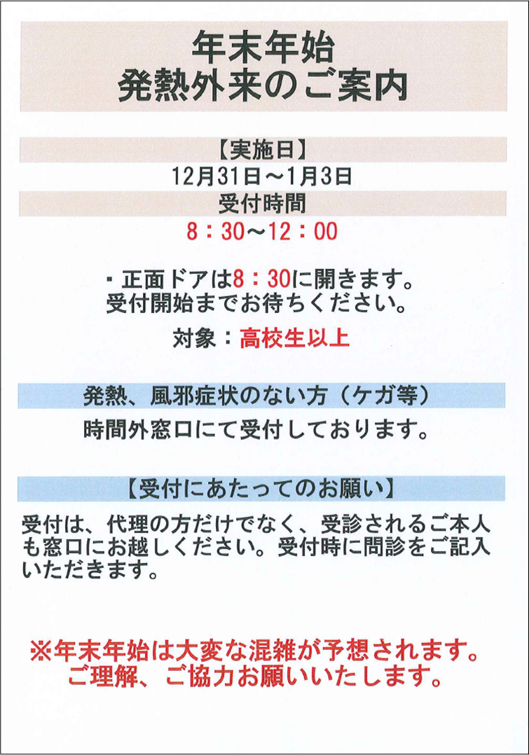 年末年始発熱外来のご案内 2025/12/30 年末年始の発熱外来は下記の通り実施いたします。 ご理解、ご協力を賜りますようお願い申し上げます。 【実施日】 12月31日㈬~1月3日㈯ 【受付時間】 8:30~12:00